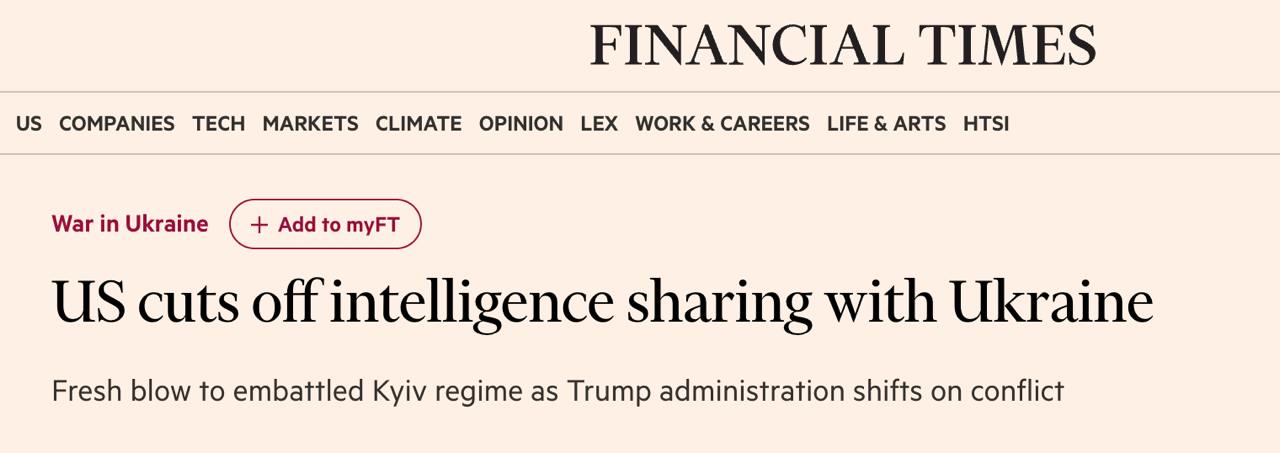 В свою очередь британская газета Financial Times со ссылкой на источники тоже написала, что США прекратили обмен разведданными с Украиной вместе с прекращением прочей военной помощи.