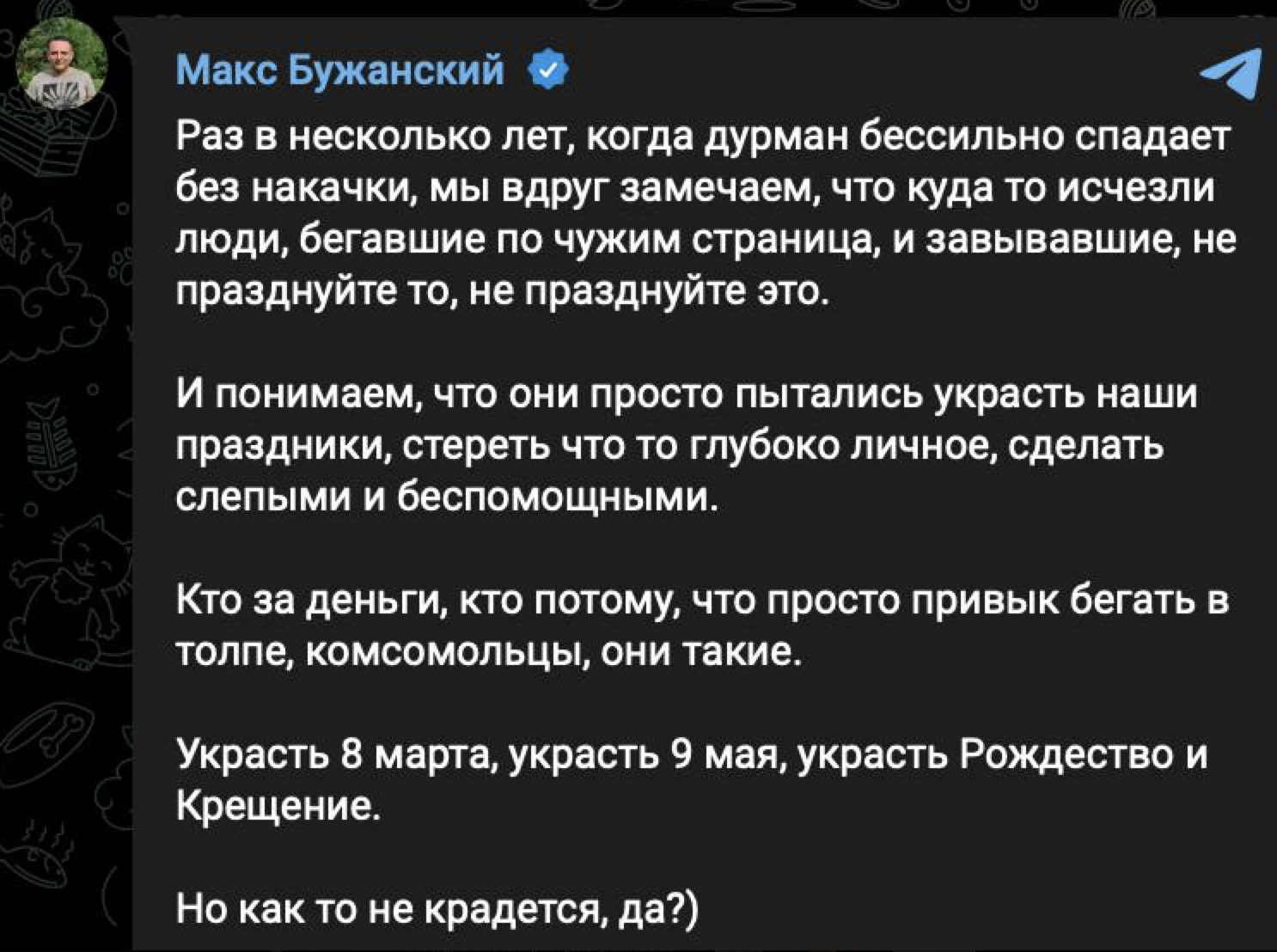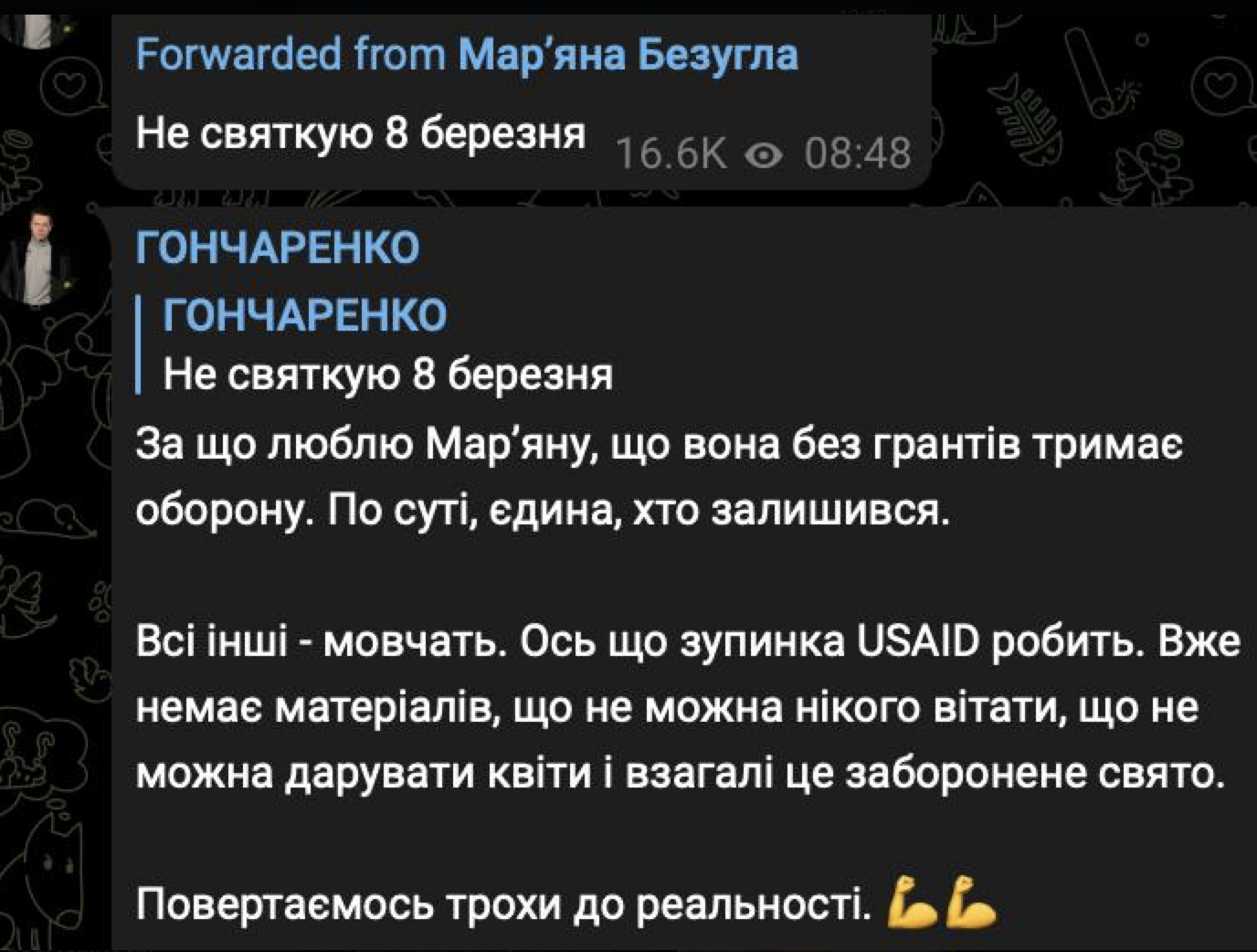"Вот что делает остановка USAID. Уже нет материалов о том, что нельзя никого поздравлять, что нельзя дарить цветы и вообще, что это запрещенный праздник", - написал он.