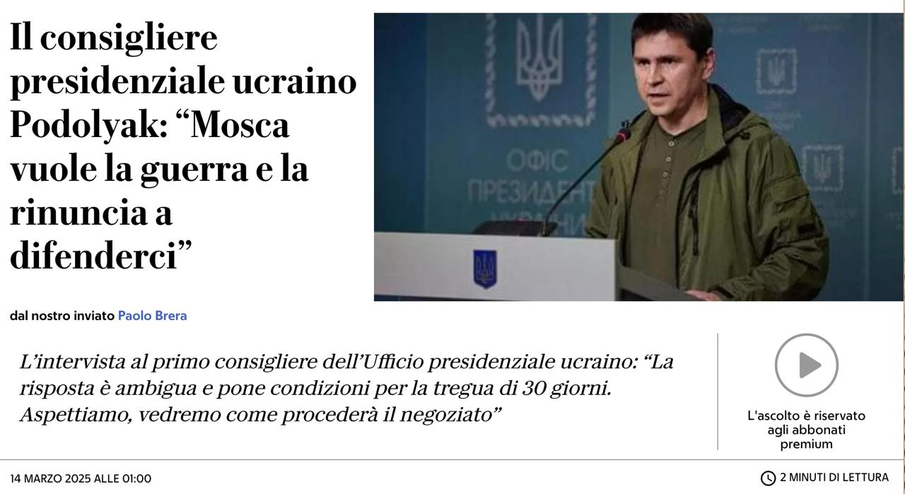 Об этом заявил газете Le Repubblica советник главы Офиса президента Михаил Подоляк.