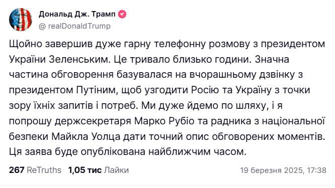 Я поблагодарил президента Трампа и американский народ за поддержку. Я подчеркнул, что украинцы хотят мира, поэтому Украина приняла предложение о безоговорочном прекращении огня. Я подчеркнул важность концепции мира через силу президента Трампа. Мы договорились поддерживать постоянный контакт, в том числе на самом высоком уровне и через наши команды".
