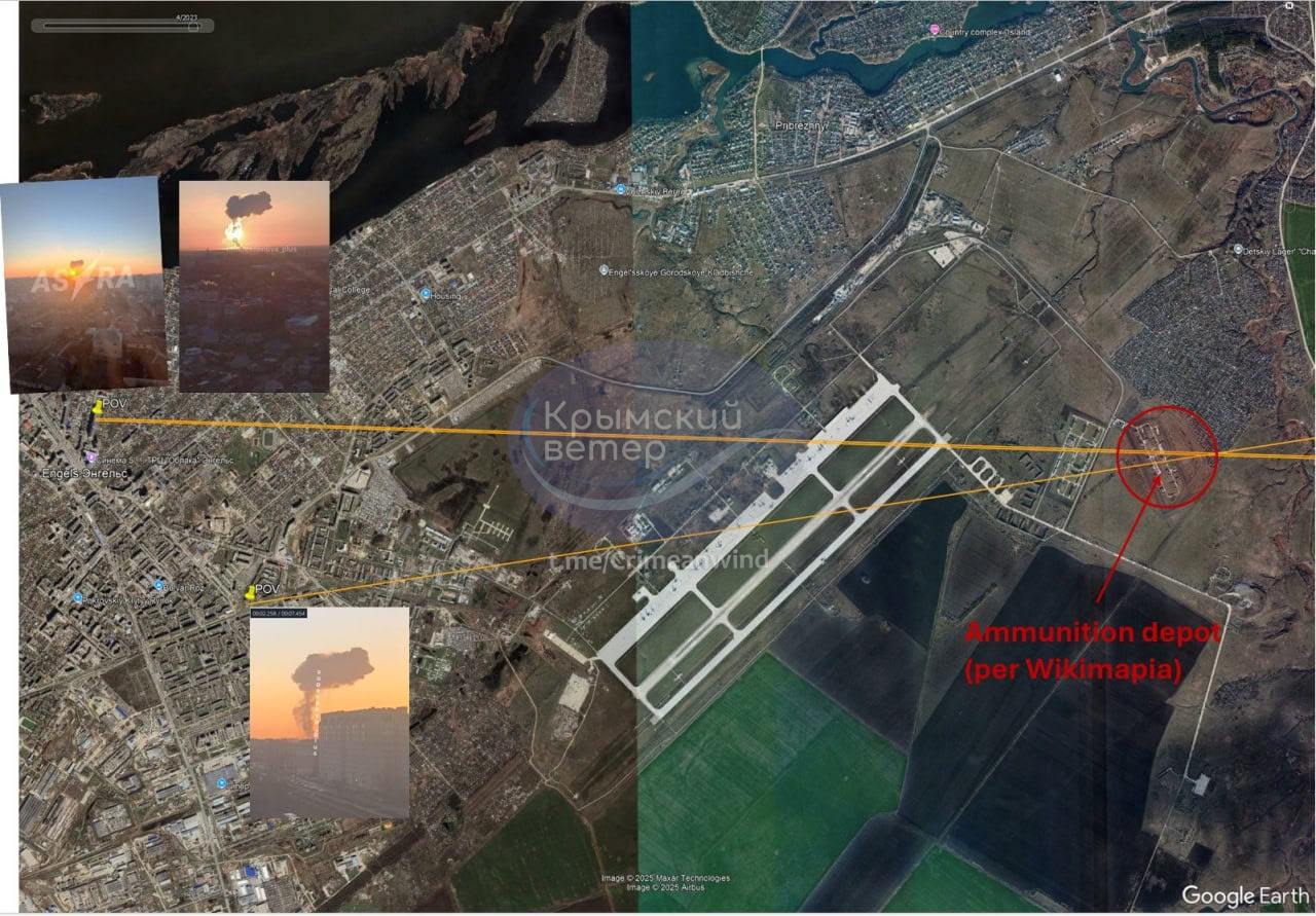 Сообщается, что в районе аэродрома зафиксирован пожар, взрывы и вторичная детонация боеприпасов.