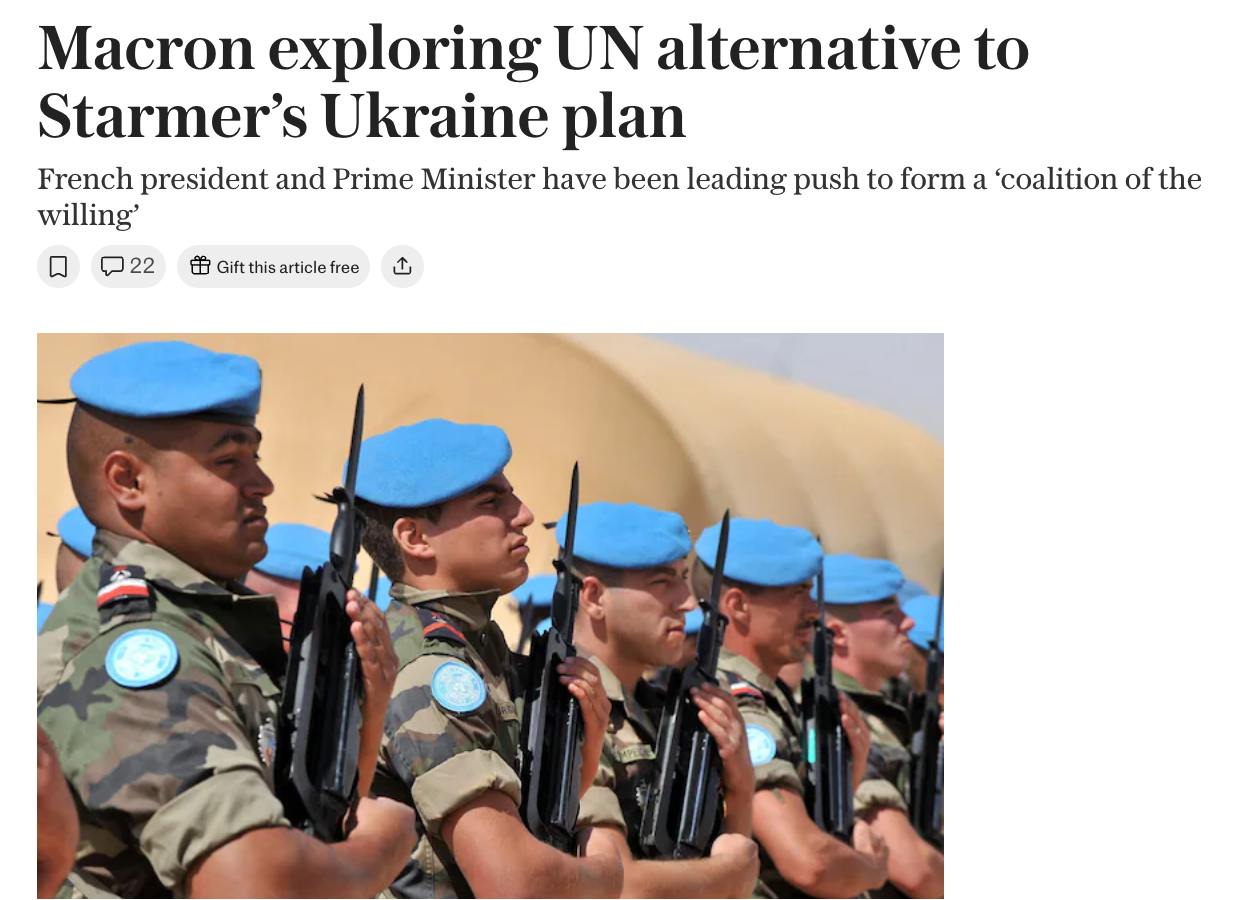 По данным издания, президент Франции Эммануэль Макрон рассматривает возможность создания миротворческой миссии для Украины под эгидой ООН.