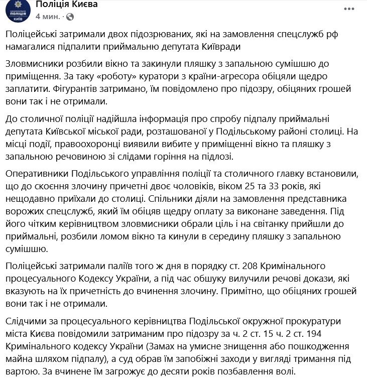Подозреваемые задержаны. Это мужчины 25 и 33 лет из Киевской и Сумской областей.