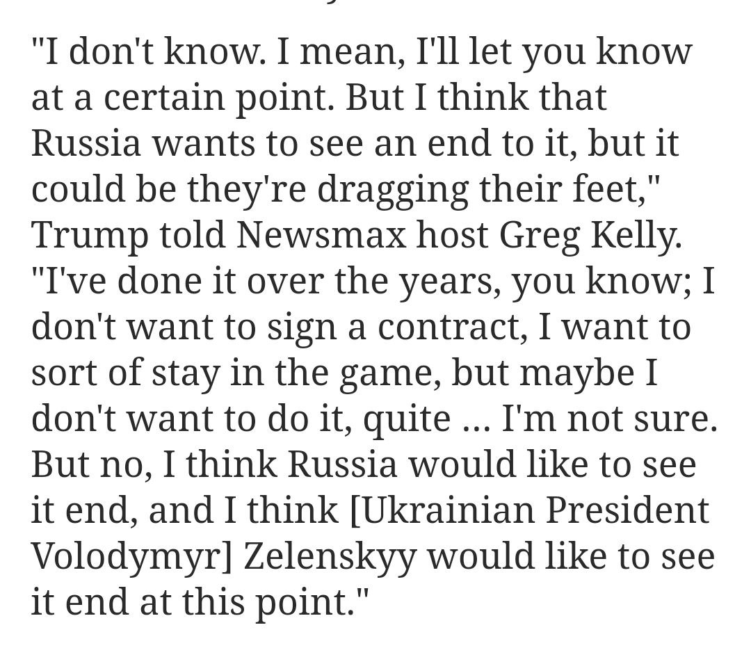 "Думаю, Россия хочет, чтобы это закончилось, хотя, возможно, они тянут время. Я поступал так на протяжении многих лет, знаете ли; я не хочу подписывать контракт, я хочу как бы оставаться в игре, но, может быть, я не хочу этого делать… Я не уверен. Но нет, я думаю, Россия хотела бы, чтобы это закончилось, и думаю, на данный момент тоже этого хочет", - сказал Трамп.