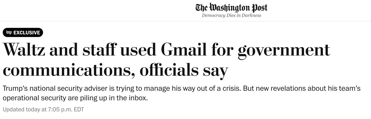 Один из помощников Уолтца вел переписки через Gmail с коллегами из других правительственных ведомств. Письма касались чувствительных военных вопросов, событий в Йемене и систем вооружения. На почту Gmail советника Трампа отправляли менее конфиденциальную информацию, например, его расписание и другие рабочие документы. По словам источников газеты, иногда Уолтц копировал и вставлял фрагменты своего расписания в Signal, чтобы координировать встречи и обсуждения.