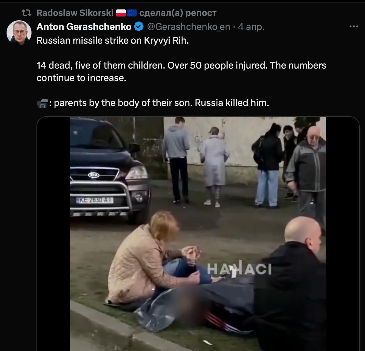 Украинские власти удар по Кривому Рогу сейчас подают как аргумент в пользу необходимости усиления давления на РФ, поскольку Москва "не хочет заканчивать войну". Именно такой месседж украинская власть пыталась донести до США еще до трагедии в Кривом Роге. И эти усилия после российского удара по городу резко возросли. Траур объявили не только в Кривом Роге, но и в ряде других городов по всей Украине.