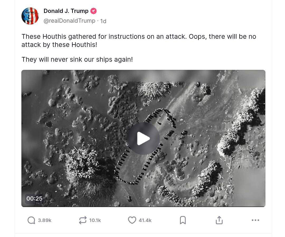 А Дональд Трамп в ночь после удара РФ по Кривому Рогу, опубликовал с "веселым" комментарием видео американского удара по скоплению хуситов.