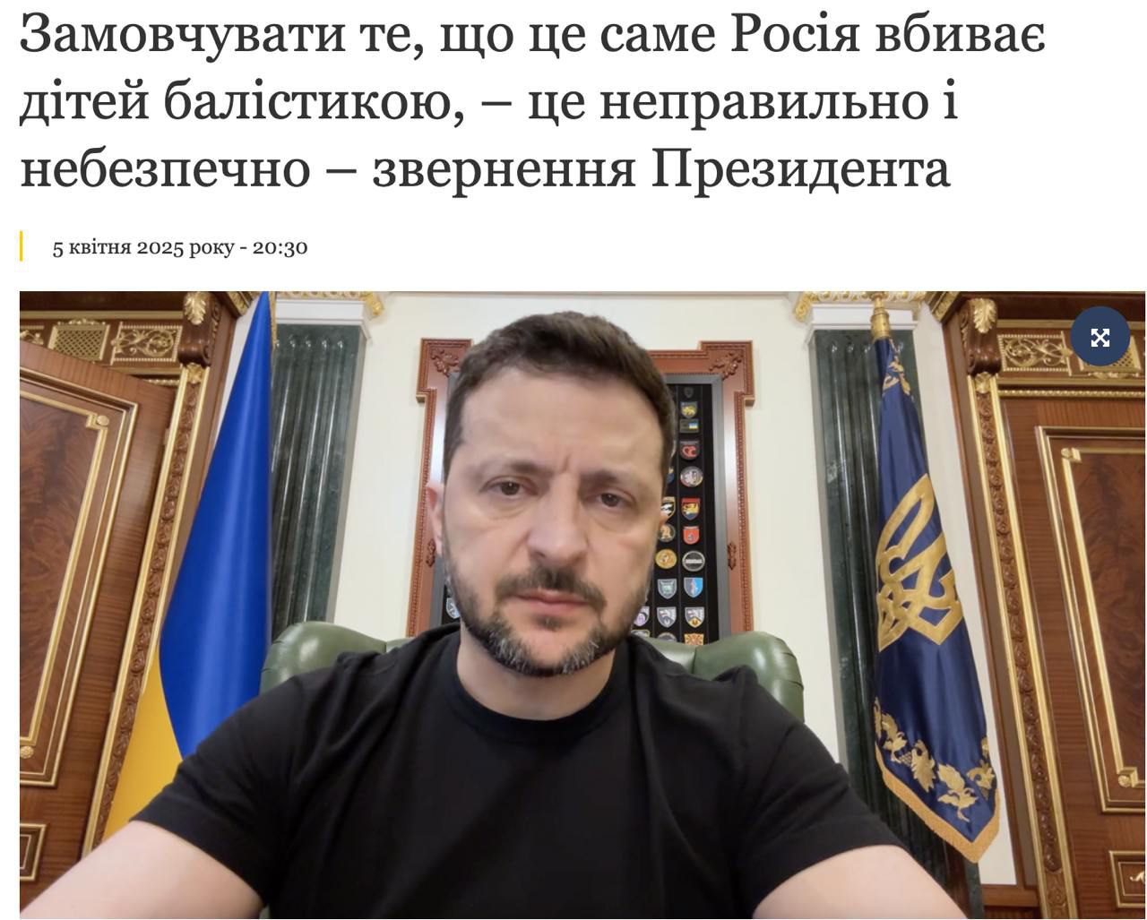 Он заявил, что "неправильно и опасно умалчивать о том, что это Россия убивает детей баллистикой". Эту мысль Офис президента вынес в название текстовой версии обращения.