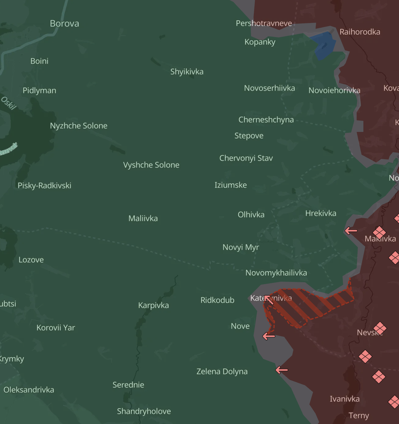 Армия РФ развивает наступление на Лиманско-Оскольском фронте в Харьковской и в Луганской областях. Карта украинского военного паблика DeepState показывает, что россияне продвинулась в Екатериновке и наступают в сторону Боровой.