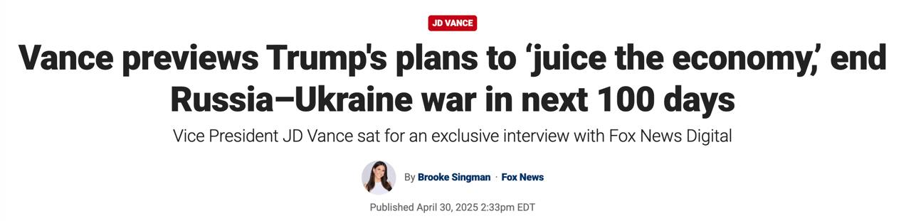 "Первые 100 дней — это вы почти исправляете и решаете все те вещи, которые очень легко сделать. В следующие 100 дней многое не изменится так быстро. Очевидно, у нас есть много вопросов внешней политики, над которыми мы работали, и как мне кажется, они так или иначе дадут результат в течение следующих 100 дней... Президент хотел бы добиться прочного решения конфликта между Россией и Украиной, при котором не будут каждую неделю погибать 5 000 человек с обеих сторон", - заявил Вэнс.