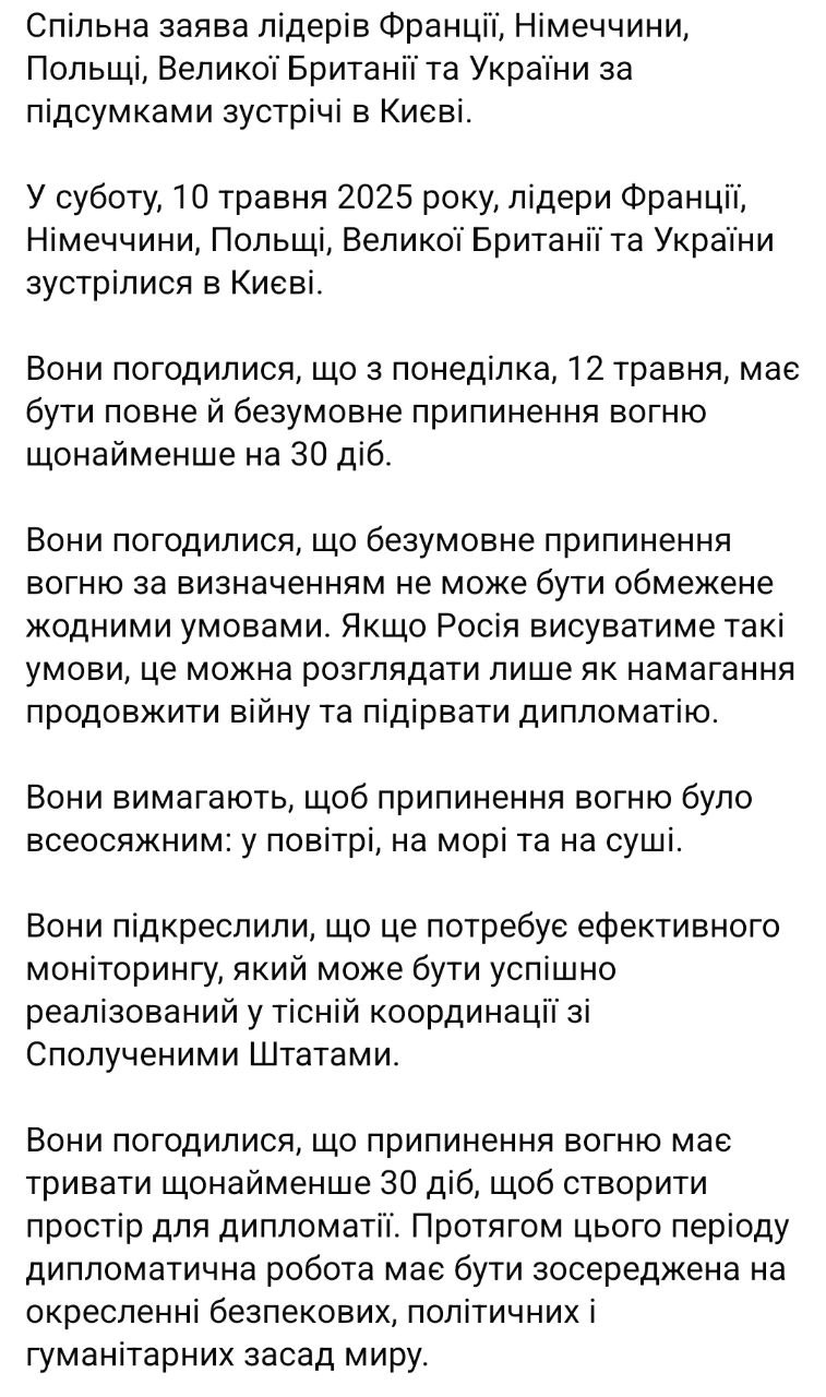 Зеленский: "с понедельника, 12 мая, должно начаться полное и безусловное прекращение огня по меньшей мене на 30 дней, и требуем этого от России. Попытки выдвинуть любые условия будут являться свидетельством затягивания войны и попытках сорвать дипломатию. Обеспечить мониторинг прекращения огня вполне возможно в координации с США. Оно должно длиться 30 дней, чтобы дать реальный шанс дипломатии. В это время работа будет сосредоточена на определении политических, основ безопасности, гуманитарных, а также основ мира. Требование прекратить огонь приветствуют не только европейские партнеры, но и Америка, которая первой предложила такую идею".