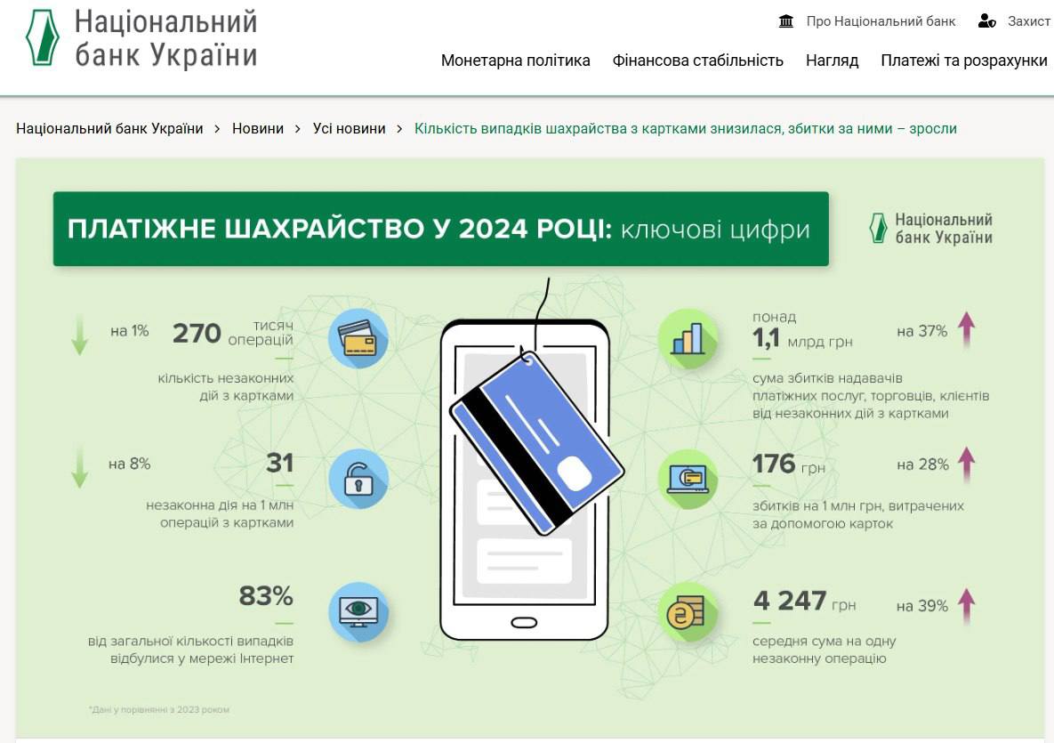 Об этом сегодня отчитался Национальный банк, который уточнил, что средний размер кражи со счета одной жертвы вырос с 3,1 тыс. в 2023 году до 4,8 тыс. грн в 2024-м. Это вместе с увеличением общего объема карточных транзакций (на 8%) привело к скачку суммы похищенных жуликами средств на 37% (до 1,1 млрд грн).