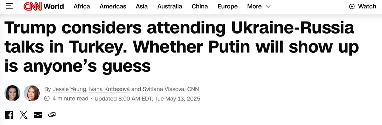 Независимо от участия Трампа на переговоры поедут его спецпредставители, чтобы наблюдать за переговорами Украины и РФ при посредничестве Турции, добавил CNN.