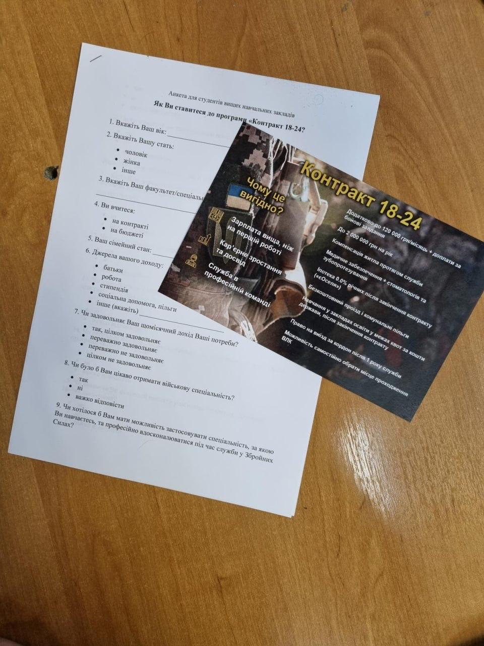 Вместе с анкетой раздают листовку с рекламой молодежных контрактов с ВСУ.