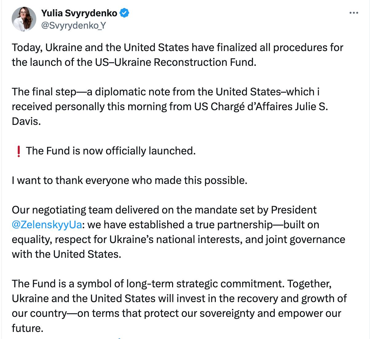 "Последним шагом была дипломатическая нота от США. Сегодня получила ее от временной поверенной в делах США в Украине Джули Девис. Теперь можно официально считать, что фонд запущен. Есть равноправное партнерство, которое уважает национальные интересы Украины, предусматривает совместное с Америкой управление и инвестирование. Работа фонда ориентирована на будущее, в котором США и Украина совместно вкладываются в восстановление и развитие нашего государства", - написала чиновница.