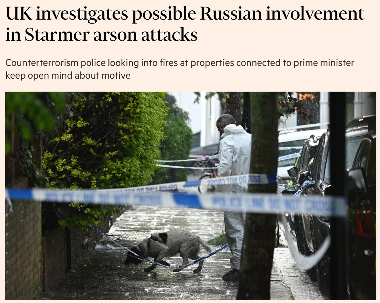 "Британские чиновники из сферы безопасности расследуют, была ли Россия вовлечена в… поджоги собственности, связанной со Стармером", - говорится в сообщении.