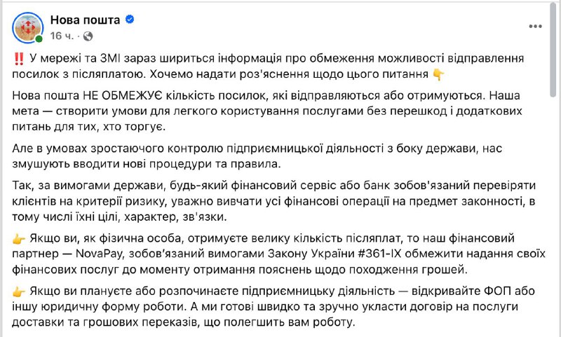 Так, по требованиям государства любой финансовый сервис или банк обязан проверять клиентов на критерии риска, внимательно изучать все операции на предмет законности, в том числе их цели, характер, связи. Если вы как физическое лицо получаете большое количество наложенных платежей, то наш финансовый партнер NovaPay обязан требованиям закона Украины #361-IX ограничить предоставление своих финансовых услуг до момента получения объяснений о происхождении денег. Если вы планируете или начинаете предпринимательскую деятельность, открывайте ФЛП или другую юридическую форму работы. Мы готовы быстро и удобно заключить договор на услуги доставки и денежных переводов, что облегчит вам работу", - предупредили в компании.