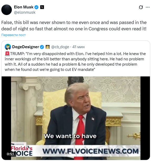 Напомним, Маск резко раскритиковал новый законопроект Трампа о государственных расходах.