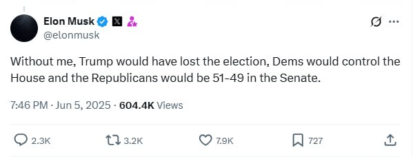 В другом твите Маск заявил, что Трамп без него проиграл бы на президентских выборах 2024 года.