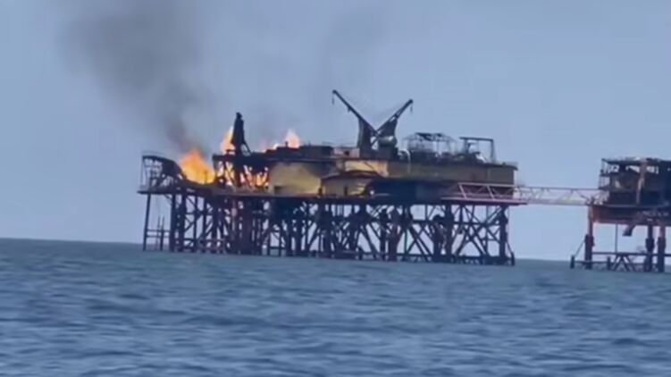На опубликованных каналами кадрах видны подрывы и пожар на платформах.