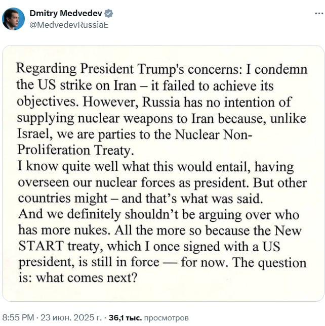 "Что касается обеспокоенности президента Трампа: я осуждаю удар США по Ирану – он не достиг своих целей. Однако Россия не намерена передавать ядерное оружие Ирану, потому что, в отличие от Израиля, мы являемся участниками Договора о нераспространении ядерного оружия", – написал Медведев в соцсети Х.
