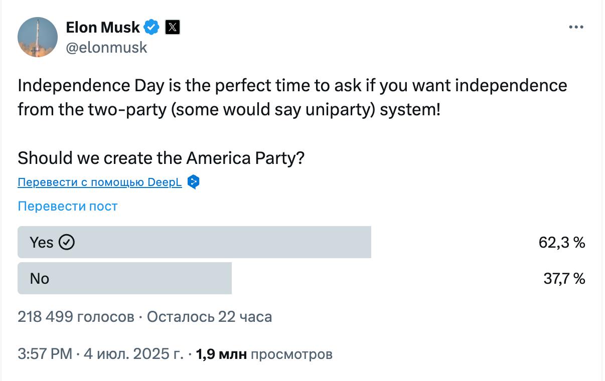 В соцсети Х миллиардер запустил опрос о необходимости создания Американской партии, приуроченный ко Дню независимости США.