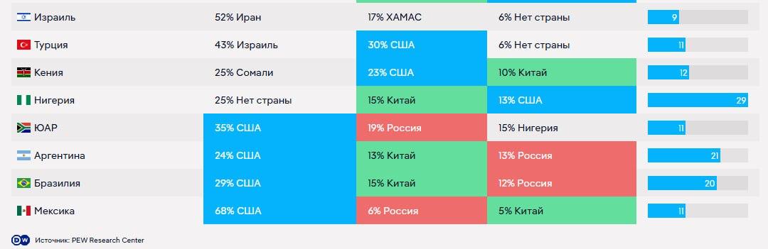 В целом же по всему миру чаще всего называют угрозой три страны: США, Россию и Китай. В Европе почти все страны считают главной угрозой Россию, кроме Испании, где основной угрозой считают США, и Греции, где на первом месте находится Турция.