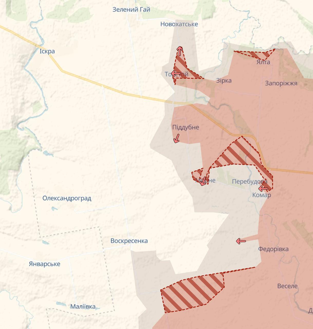 Также РФ продвинулась у границы с Днепропетровской областью. В частности, захвачена Ялта непосредственно на админгранице, а серая зона зашла в соседнее Новохатское. И есть продвижение на ряде других соседних участков.