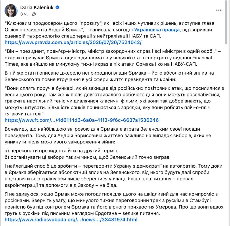 "Поэтому пока у Ермака сохраняется абсолютное влияние на Зеленского, от него будут идти и дальше попытки подставить всю страну, лишь бы сохраниться у власти. Если цена вопроса – провал евроинтеграции и помощи от Запада – не беда. Я не удивлюсь, если Ермак может согласиться для этого на невыгодный для нас компромисс с россиянами. Обратите внимание, что на прошлой неделе переговорный трек с россиянами в Стамбуле был полностью под контролем Ермака и его верного прихвостня Умерова. О чем они трут с россиянами под пристальным наблюдением Эрдогана – большой вопрос", - отметила Каленюк.