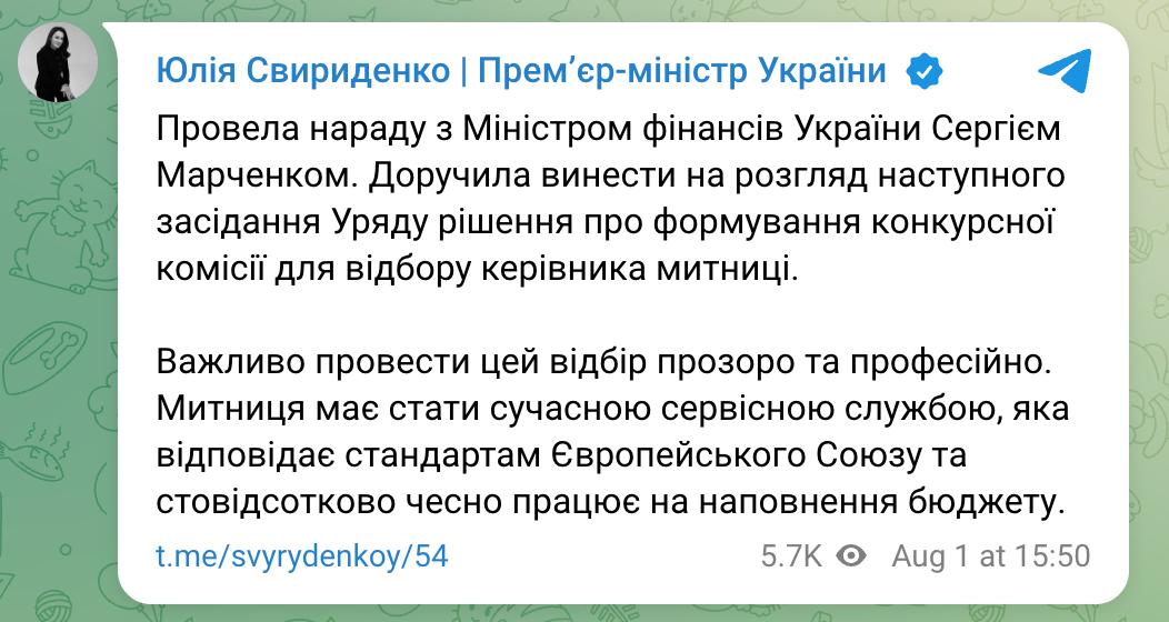 Премьер-министр Юлия Свириденко анонсировала запуск процедуры отбора руководителя таможни. Такая процедура прописана в меморандуме об экономической и финансовой политике с Международным валютным фондом.