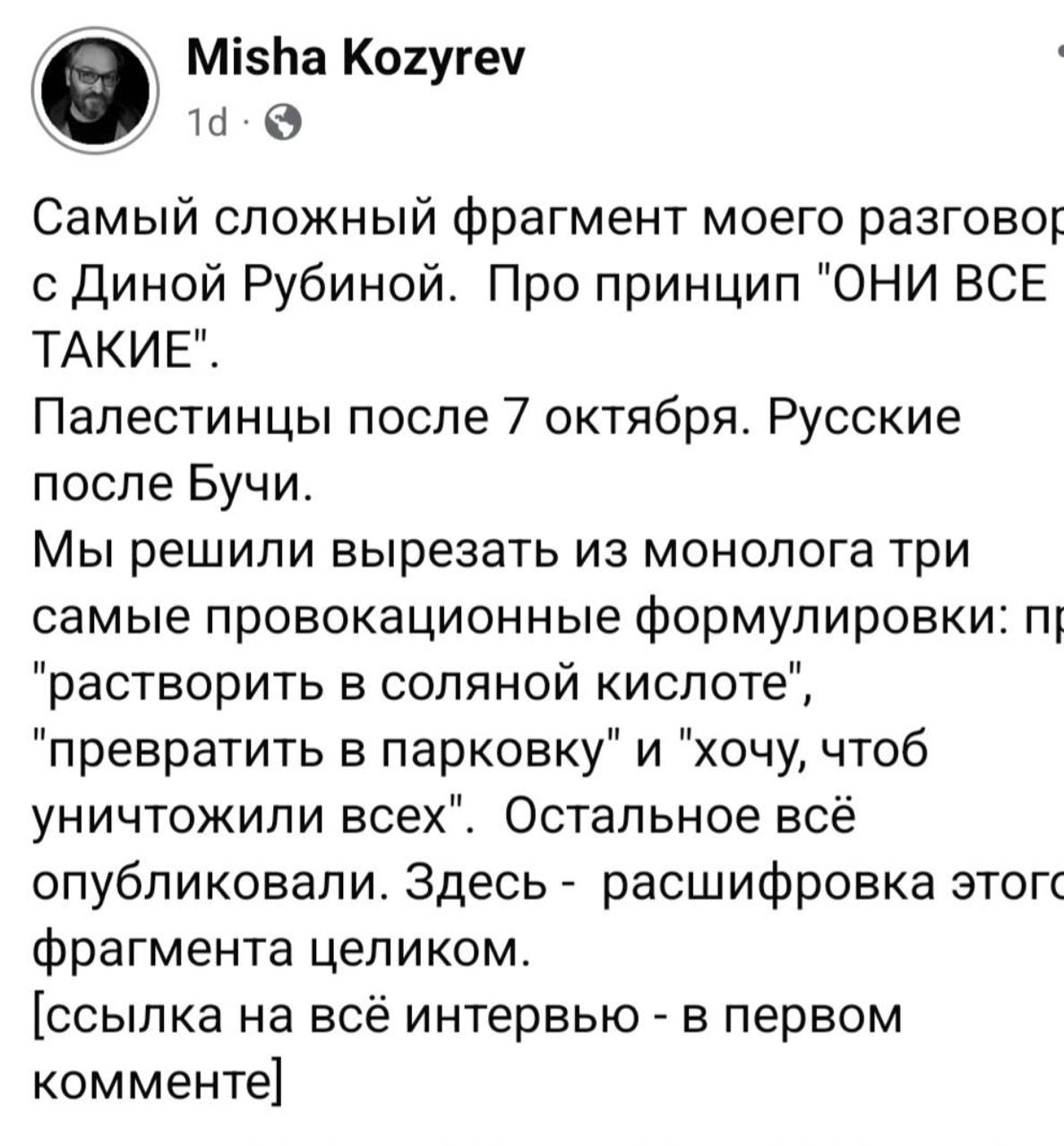 В интервью, фрагменты которого опубликовал журналист "Дождя" Михаил Козырев, Рубина заявила: "Израиль имеет право на самозащиту. Он имеет право растворить их всех в соляной кислоте. Он имеет право расчистить Газу и превратить её просто в парковку. Вот на что имеет право Израиль. Потому что там нет мирных жителей, нет! Я очень хочу, чтобы уничтожили всех. Возможно, я кого то шокирую. Я даже думаю, большинство народа я шокирую. Пусть".