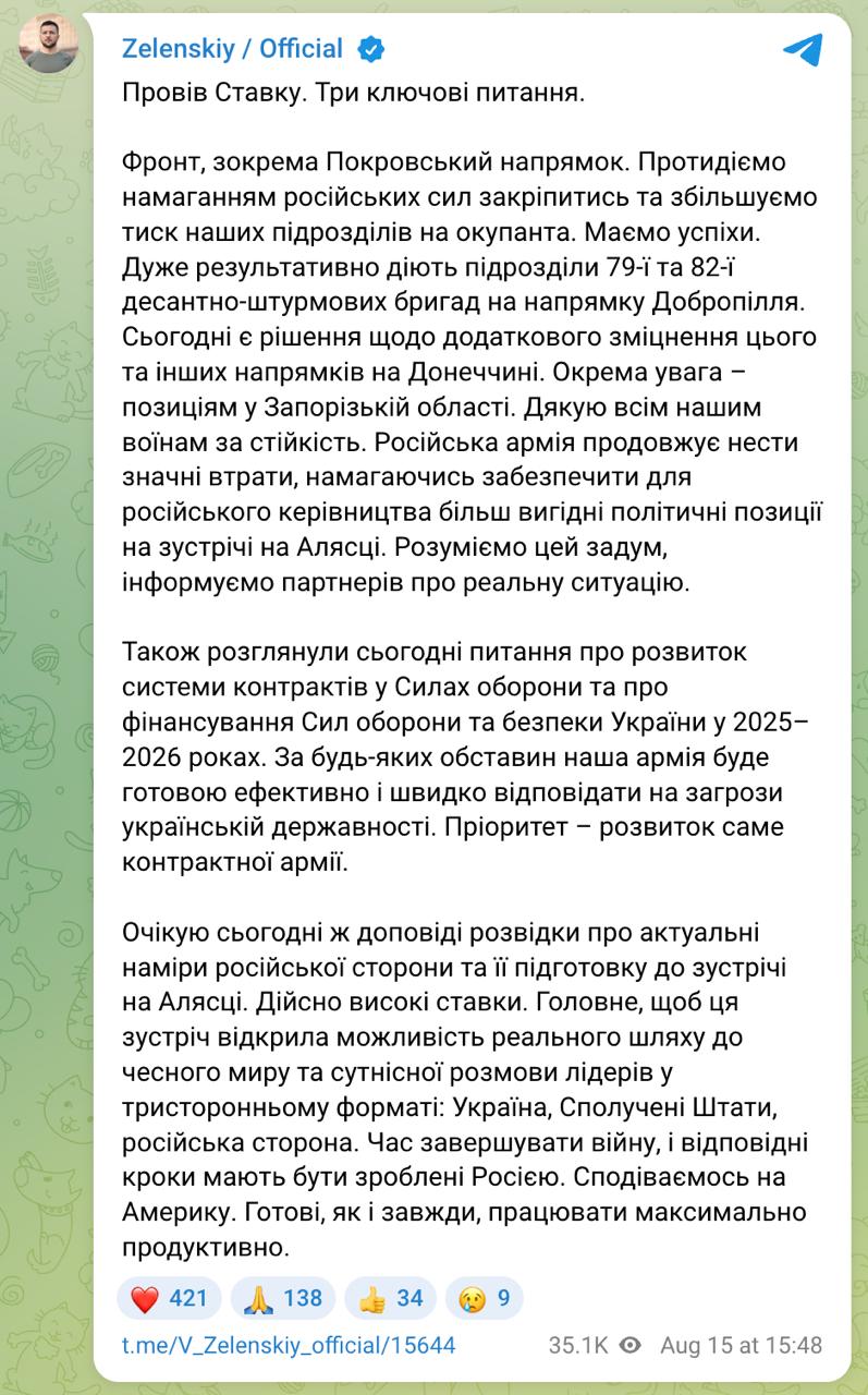 "Главное, чтобы эта встреча открыла возможность реального пути к честному миру и разговору лидеров в трехстороннем формате: Украина, Соединенные Штаты, российская сторона. Настало время закончить войну", - пишет президент.