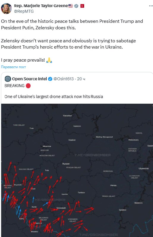 Член американской палаты представителей и Республиканской партии Марджори Тейлор Грин обвинила Владимира Зеленского в ударах по России с использованием беспилотников для саботажа переговоров Дональда Трампа и Владимира Путина на Аляске.