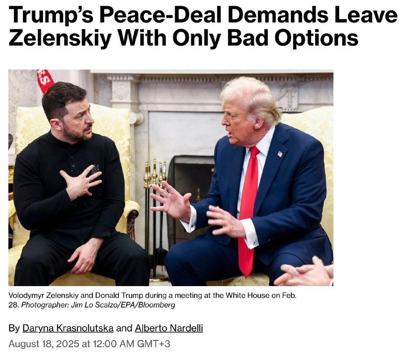 Об этом пишет Bloomberg, отмечая, что после саммита на Аляске, который не привел к прекращению огня, Трамп "практически не оставил Зеленскому пространства для манёвра".