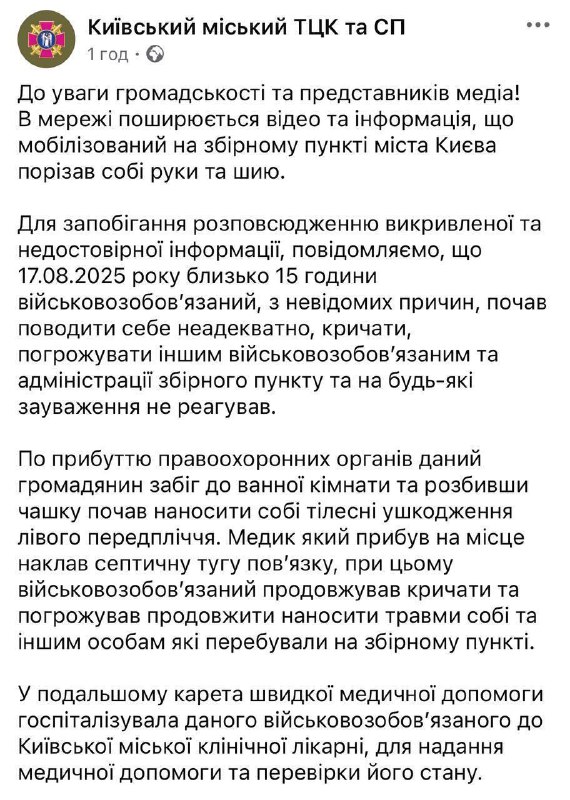 17.46 Киевский ТЦК подтверждает, что вчера днем мобилизованный порезал себе вены. Судя по сообщению, его жизни ничего не угрожает.
