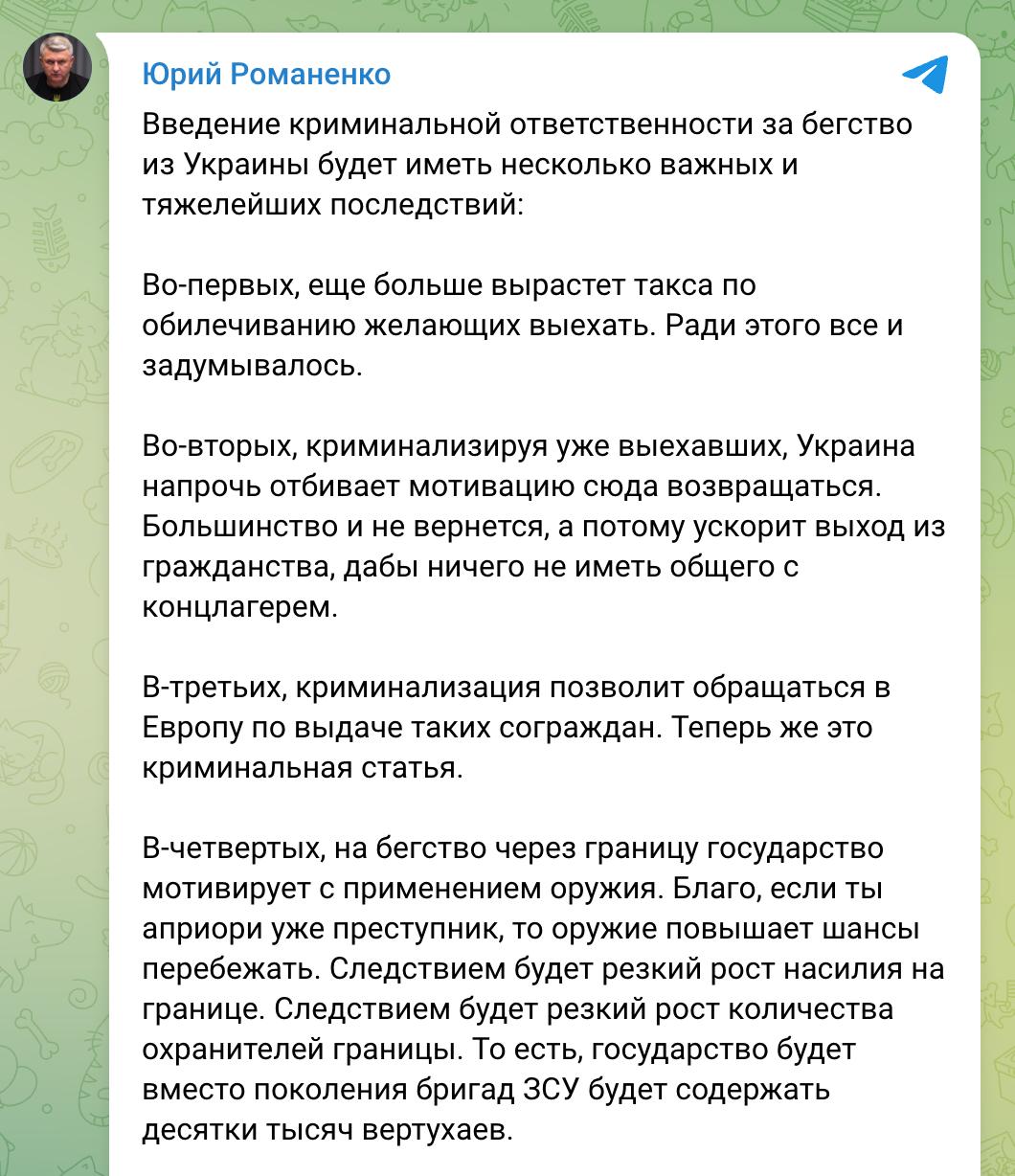 "Введение криминальной ответственности за бегство из Украины будет иметь несколько важных и тяжелейших последствий. Во-первых, еще больше вырастет такса по обилечиванию желающих выехать. Ради этого все и задумывалось.