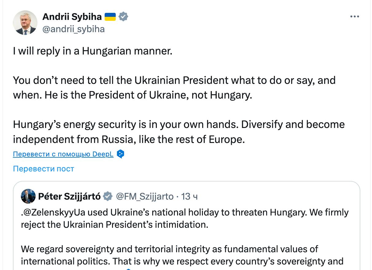 "Я отвечу в венгерской манере. Вам не нужно указывать президенту Украины, что ему делать или говорить и когда. Он президент Украины, а не Венгрии. Энергетическая безопасность Венгрии находится в ваших руках. Диверсифицируйте энергоносители и станьте независимыми от России, как и остальная Европа", - написал Сибига в Х.