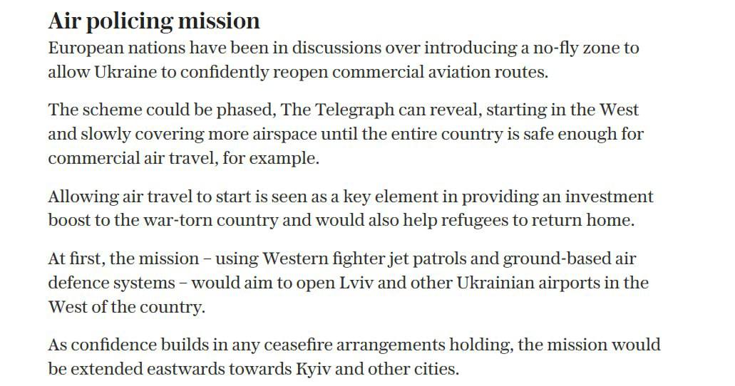 В статье The Telegraph о возможном размещении американских ЧВК в Украине говорится об обсуждении создания над Украиной бесполетной зоны после возможного перемирия.