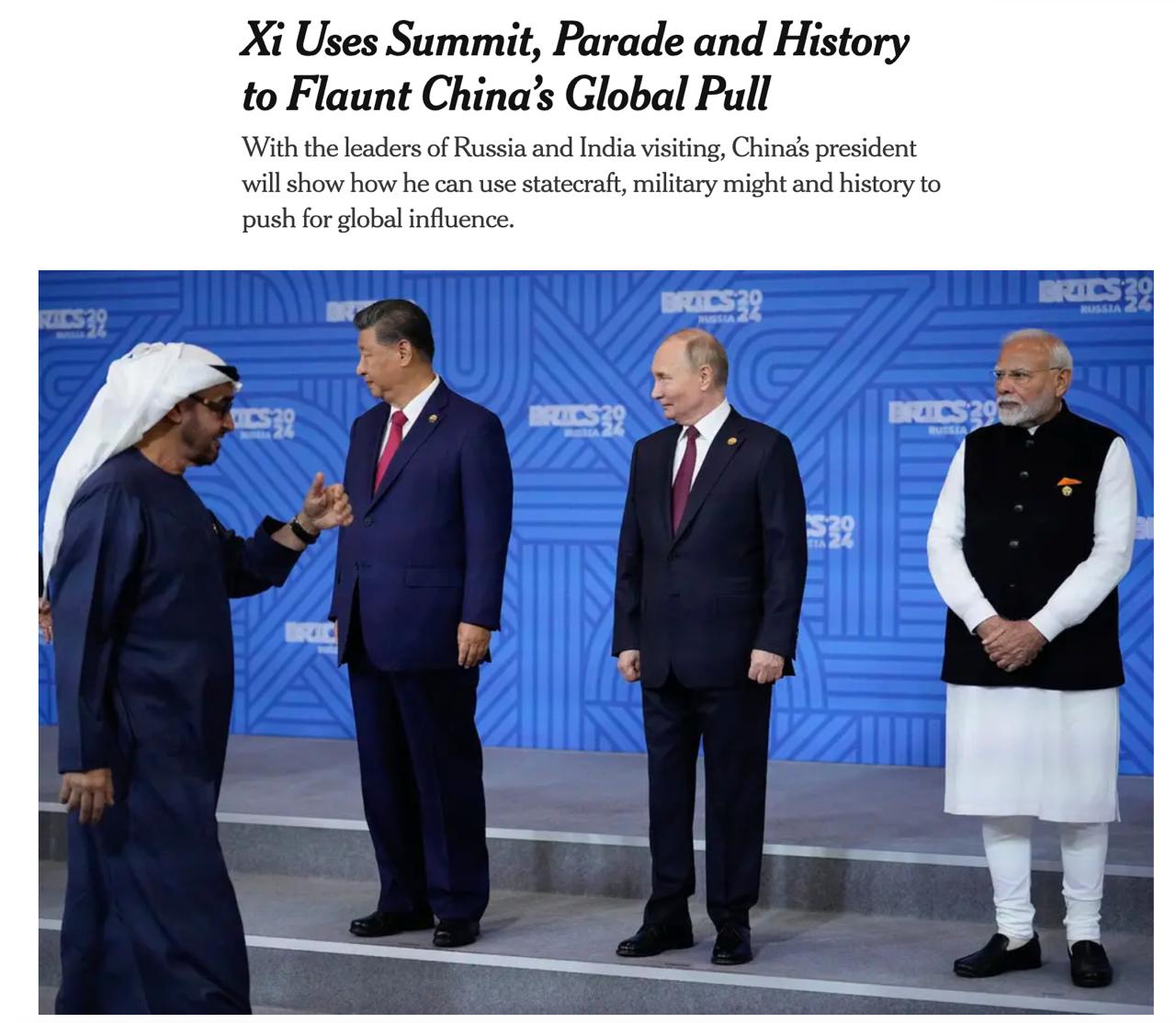 "Саммит и парад позволят Путину и Си подтвердить их тесные отношения — партнёрство, которое Запад пытался, но в значительной мере так и не смог разрушить… Сближение Путина и Моди с Китаем, а также участие лидеров десятков других развивающихся стран, включая Турцию, Египет, Малайзию и Пакистан, контрастирует с растущими противоречиями в альянсе США с европейскими и азиатскими странами", - считает газета.