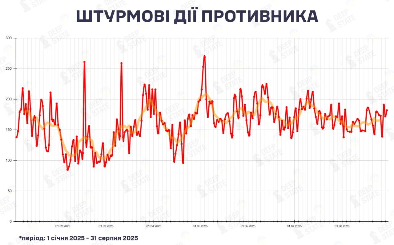 15.36 Армия РФ в августе менее активно наступала, чем в июле, июне и мае и провела около 5027 штурмовых действий, сообщает Deep State.