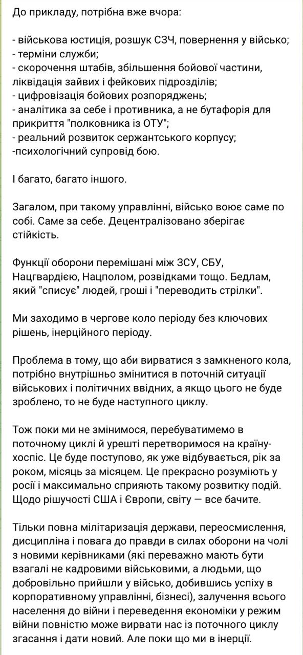 "Мы продолжаем "верить в ВСУ", избегать ВСУ или же, попав в систему, пытаемся "порешать с ВСУ" разными путями. Меньшинство воюет, а еще меньшее меньшинство – идейно. Но в то же время не обвиняю большинство: большинство нужно направлять, чтобы люди доверяли системе, понимали свой путь и знали, что их не отправят на смерть за косой взгляд или пост в Фейсбуке", - заявила нардеп.
