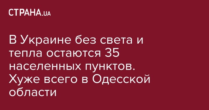 Остаются обесточенными 35 населенных пунктов в пяти областях, а именно: Одесской – 24 населенных пунктов, Херсонской – 7 населенных пунктов, Николаевской – 2 населенных пунктов, Днепропетровской – 1 населенных пунктов, Волынской – 1 населенных пунктов.