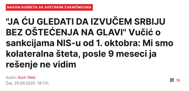 "Россияне являются мажоритарным партнёром в NIS, но высокую цену заплатим именно мы. Нас ждут тяжёлые времена и тяжёлая зима. Мы сделаем всё возможное, чтобы граждане имели тёплую зиму в своих домах, чтобы они не беспокоились о снабжении топливом. Теперь после этого у нас всё дополнительно осложняется и создаёт политические, экономические и всяческие другие проблемы. Мы будем бороться и искать выход из этой исключительно тяжёлой ситуации, вести переговоры. Уже 8–9 месяцев я этим занимаюсь круглосуточно, но ещё не нашёл решения", - признался Вучич.