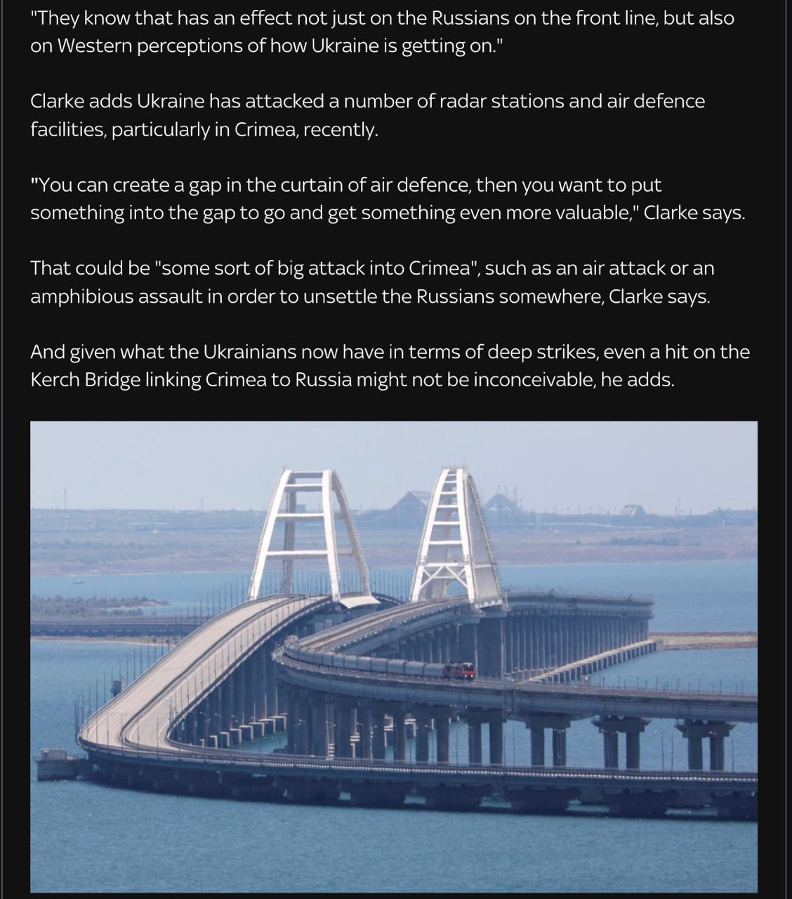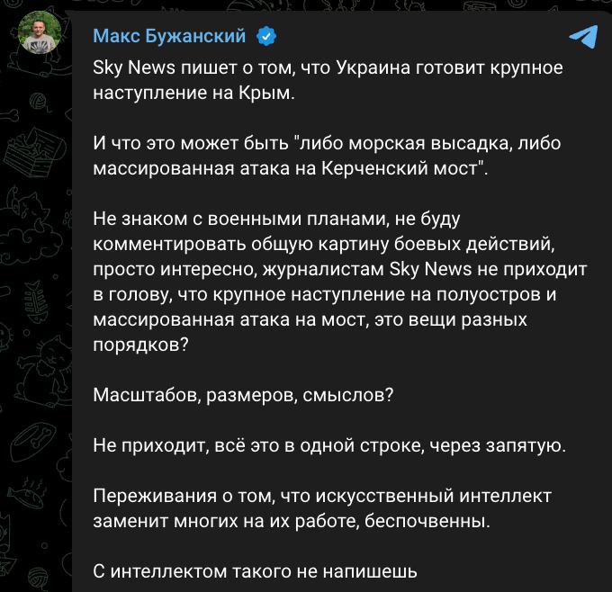 "Sky News пишет о том, что Украина готовит крупное наступление на Крым. И что это может быть "либо морская высадка, либо массированная атака на Керченский мост". Не знаком с военными планами, не буду комментировать общую картину боевых действий, просто интересно: журналистам Sky News не приходит в голову, что крупное наступление на полуостров и массированная атака на мост - это вещи разных порядков? Масштабов, размеров, смыслов? Не приходит. Всё это в одной строке, через запятую", - написал в своем Телеграме народный депутат от партии "Слуга народа" Максим Бужанский.