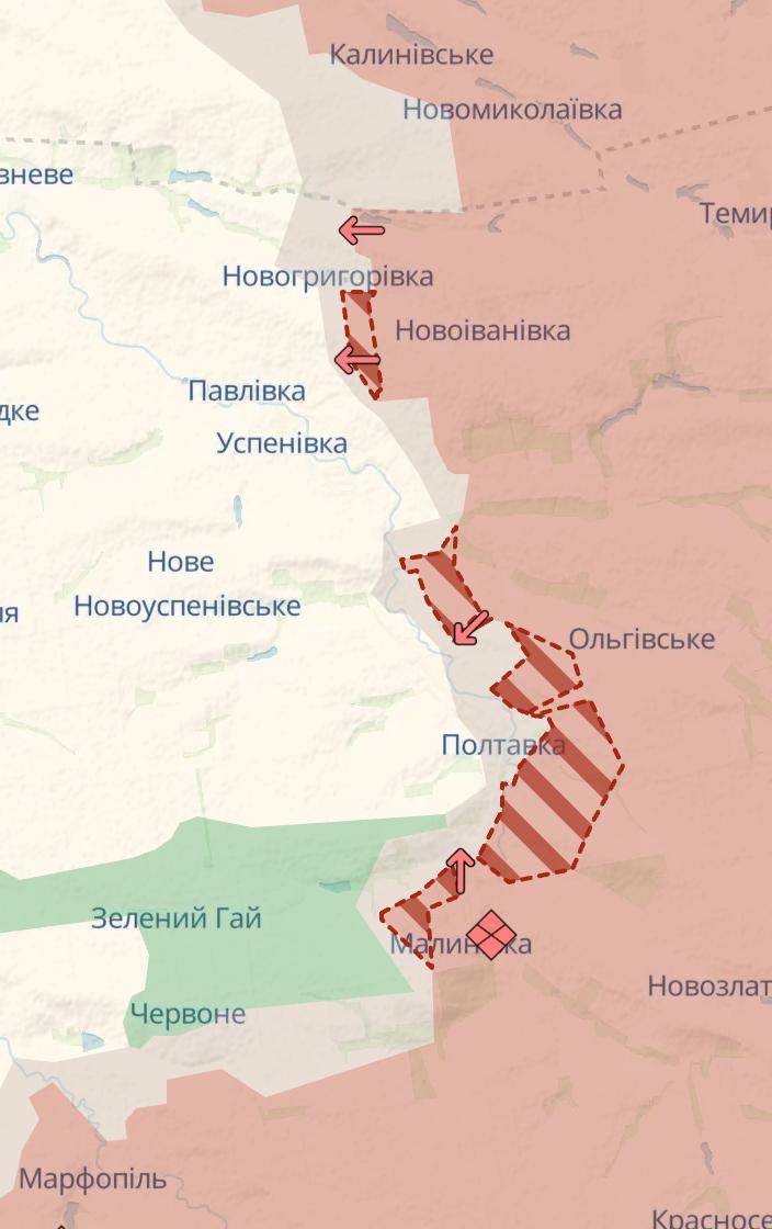 Также у РФ продвижение на пяти участках на западе Запорожской области: около Новоивановки, Охотничьего, Малиновки, Вишневого и в Полтавке.