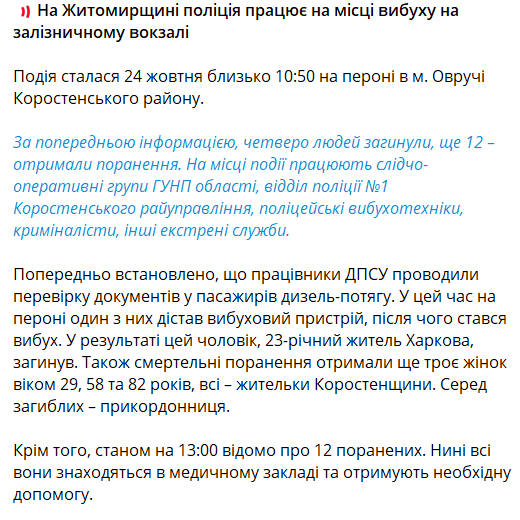 В Овруче Житомирской области мужчина взорвал гранату в пригородном электропоезде, в результате погиб сам, а с ним еще три женщины.