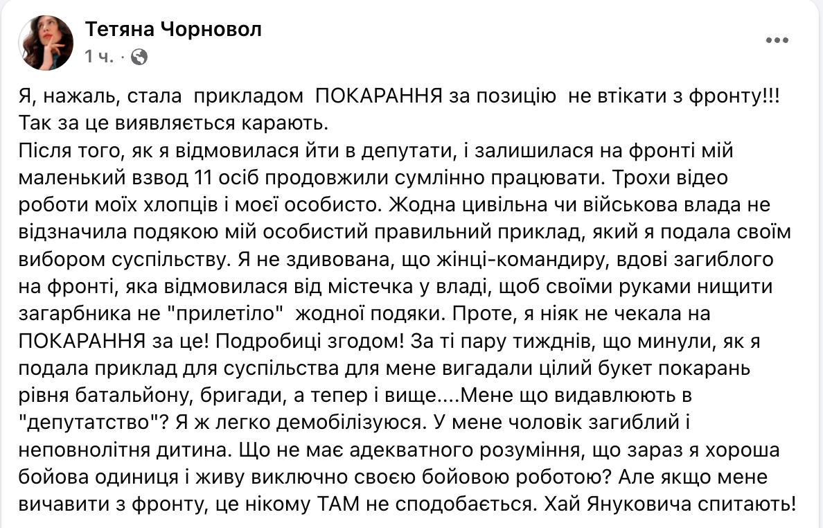 "Я не удивлена, что женщине-командиру, которая отказалась от местечка во власти, чтобы своими руками уничтожать захватчика, не "прилетело" ни одной благодарности. Однако я никак не ожидала наказания за это!" – написала Черновол.