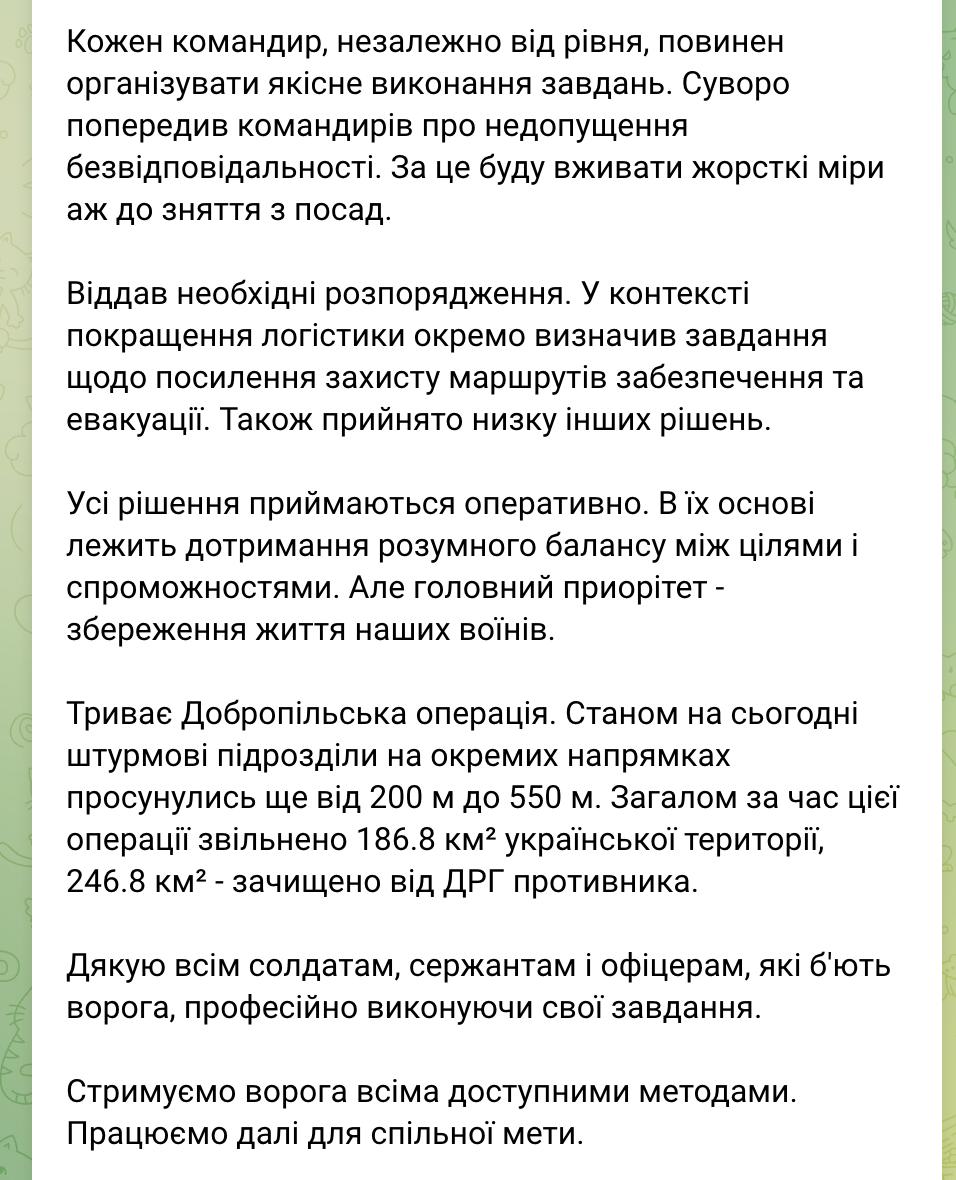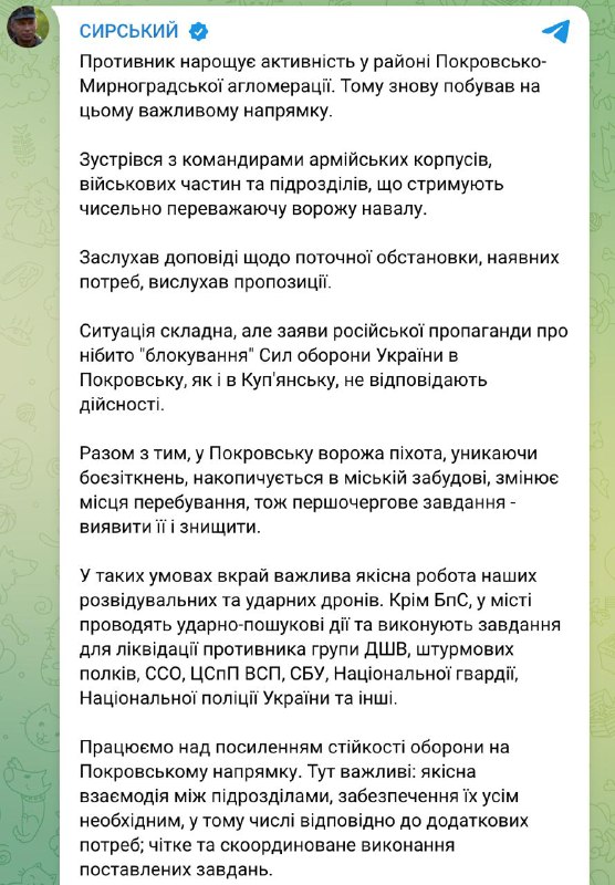 "Ситуация сложная, но заявления российской пропаганды о якобы блокировании Сил обороны Украины в Покровске, как и в Купянске, не соответствуют действительности. Вместе с тем в Покровске вражеская пехота, избегая боестолкновений, накапливается в городской застройке, меняет места пребывания, поэтому первоочередная задача - выявить ее и уничтожить", - написал главком в своих соцсетях.