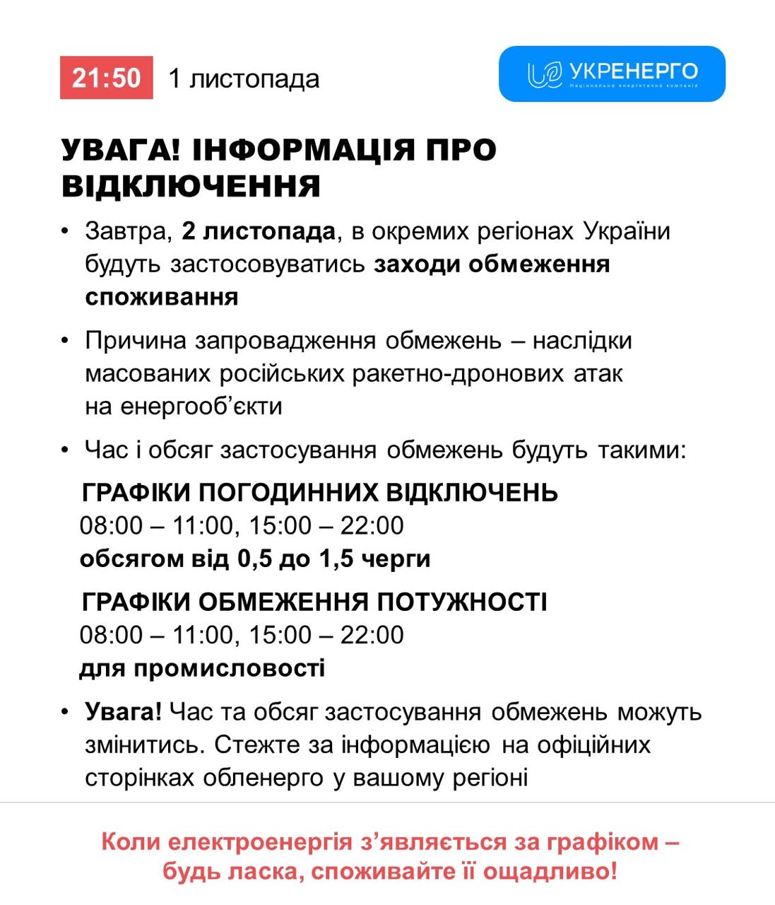 22:01 Завтра, 2 ноября, в отдельных регионах Украины будут продолжаться отключения света, сообщает "Укрэнерго".
