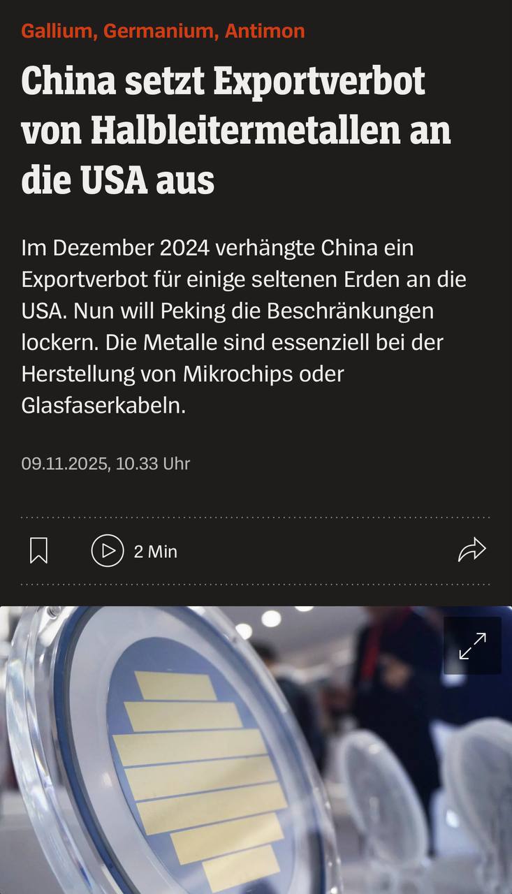"Пекин приостановил действие запрета на экспорт в США галлия, сурьмы и германия — металлов, необходимых для производства полупроводников. США, как и другие страны, закупают это сырье практически полностью в Китае. Например, галлий и германий используются в микрочипах, оптоволоконных кабелях и солнечных батареях", - говорится в статье.